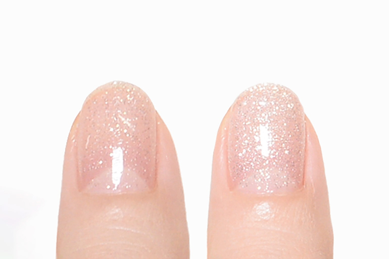 シンプルなワンカラー1度塗りでフリーエッジ(爪先端の白い部分)が透けて見える程度。2度塗りで隠れる程度の発色。仕事でもプライベートでも、日常のほぼすべての場面でお使いいただけます(ラメはアクセントとしてポイント使いしてください)。肌色の血色良く見えて、手先から好印象に。
